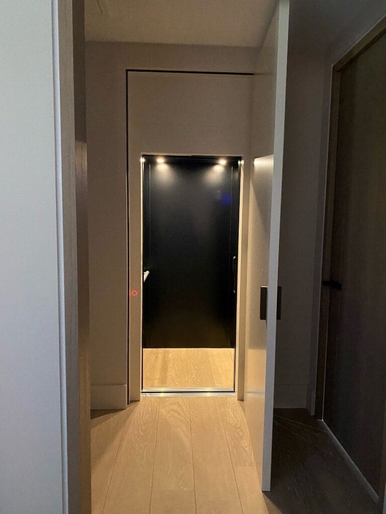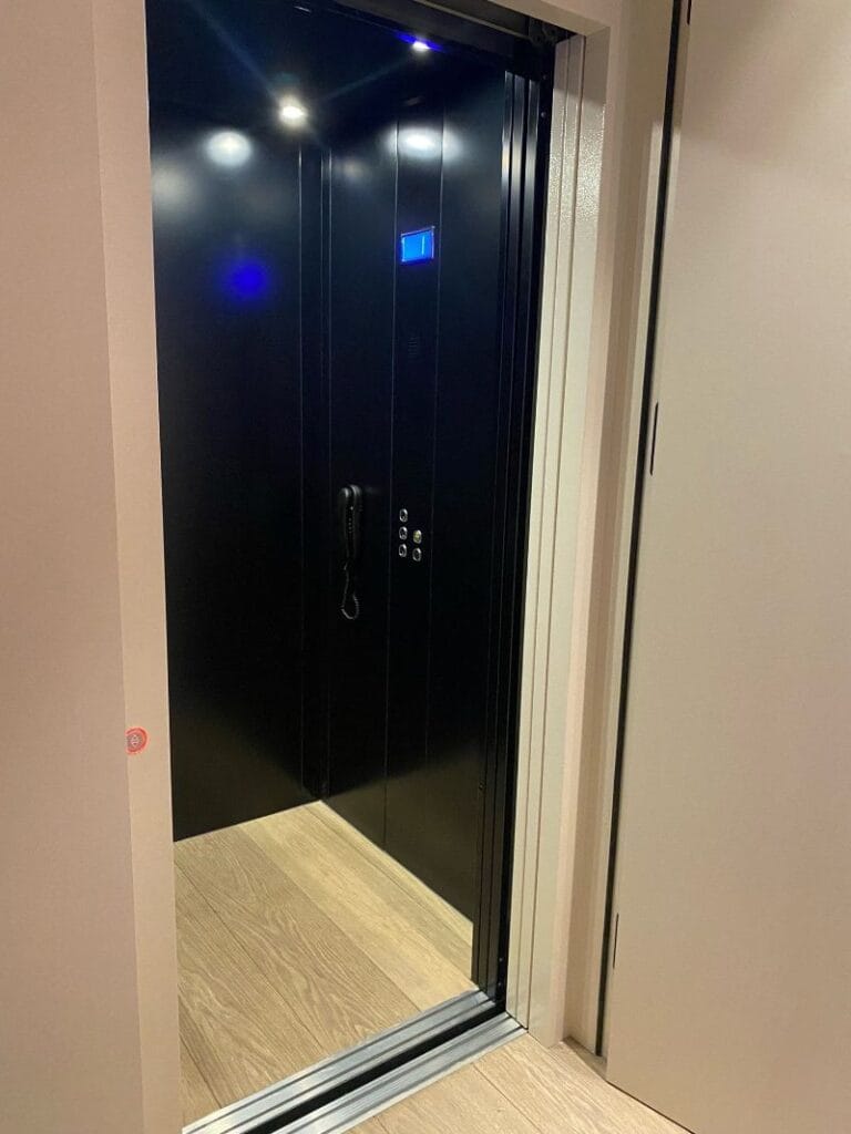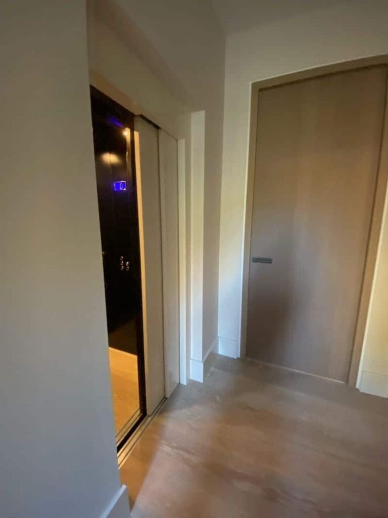 Een cabinelift in een bouwkundige schacht, dat hebben we geplaatst in een woonhuis in Warmond. Met de strakke uitstraling en de telescoopdeuren is de cabinelift een bijpassend onderdeel van het interieur. Op een stopplaats is zelfs een dubbele deur geplaatst in het kozijn, zodat de lift niet zichtbaar is.